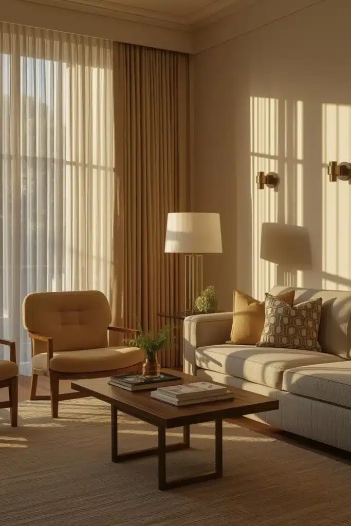 Light plays a central role in neutral interiors. Natural light should be welcomed through sheer curtains or uncovered windows. When daylight fades, warm layered lighting helps maintain softness.