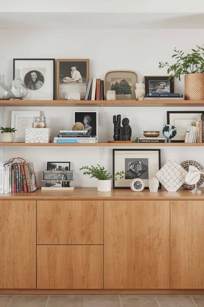 Open shelves can make small rooms feel lighter when styled carefully. Instead of filling them completely, leave space between items. A few books, a small plant, or everyday objects placed neatly create balance.