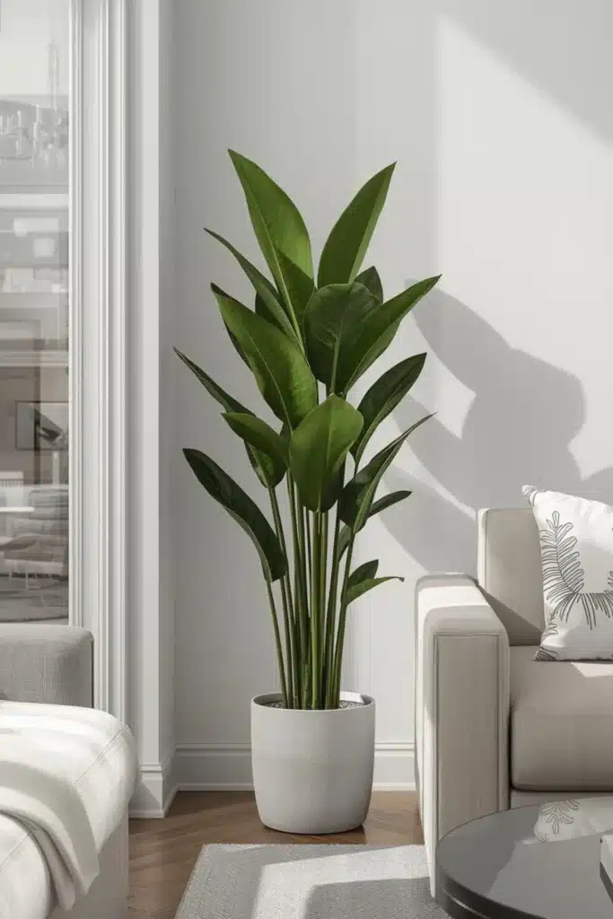 Placed near a sofa or in a living room corner, snake plants create a clean, modern look. Their upright form works well in minimalist interiors and modern living rooms with plants. They also contribute to cleaner indoor air, making them both practical and calming.
