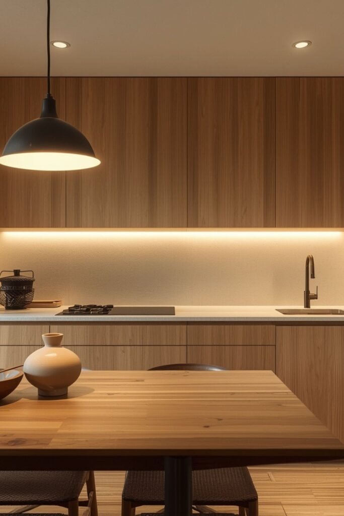Lighting in Japanese kitchens is gentle and layered. Warm under cabinet lighting, simple pendant lights, or low profile ceiling fixtures provide enough brightness without harsh glare. Natural daylight is always prioritized where possible.