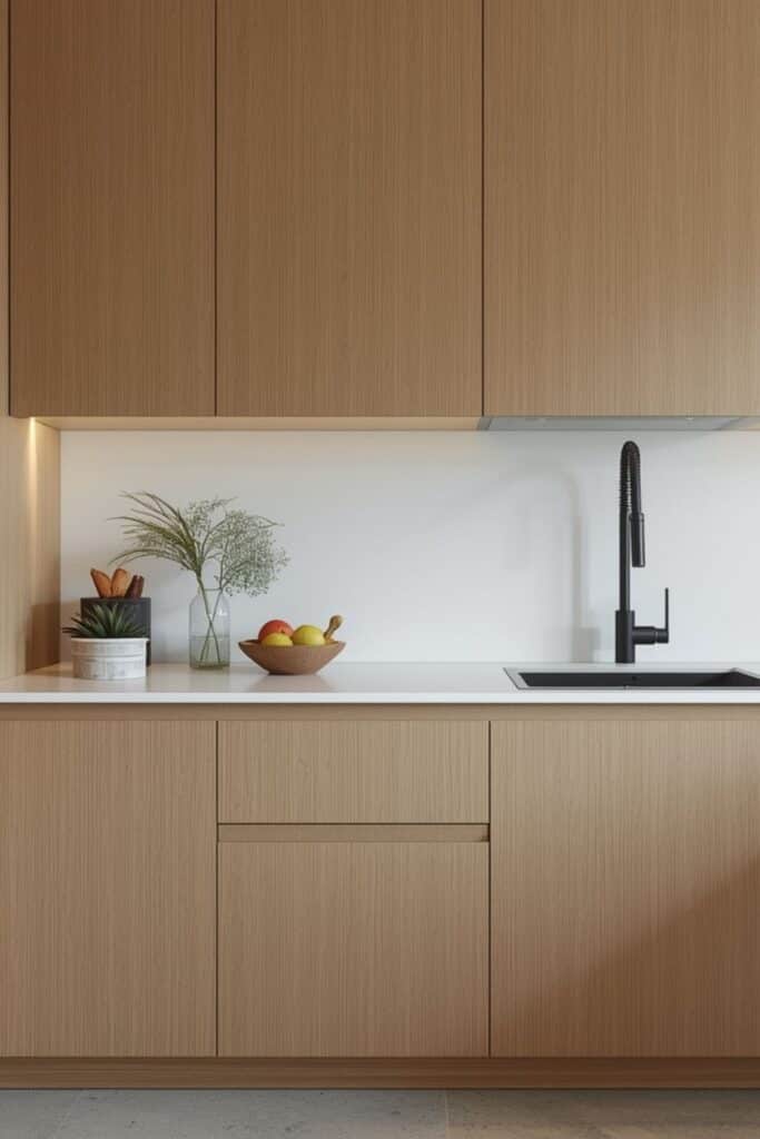 In minimal Japanese kitchen layout solutions, wood is chosen for balance rather than decoration. Light oak, ash, or maple pairs beautifully with neutral walls and matte surfaces. Even subtle wooden handles or one open shelf can change the mood of the entire kitchen. Wood connects the space to nature and supports a more relaxed cooking experience.