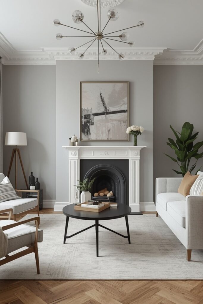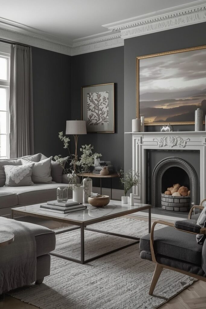 This approach suits larger UK living rooms or rooms with good natural light. When balanced with lighter elements, dark grey adds sophistication while maintaining calm. It works especially well during autumn and winter months.