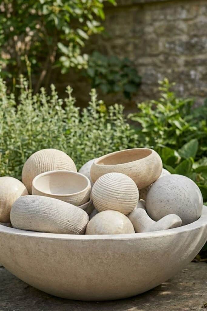 Ceramic bowls, textured orbs, or outdoor safe sculptures can be placed inside planters for a refined look. These objects bring artistic interest without relying on greenery.