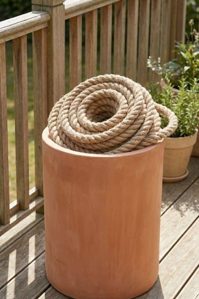 Wrapping rope or placing coiled natural fibre inside planters adds texture and softness. This approach works well for coastal, boho, or relaxed outdoor styles.