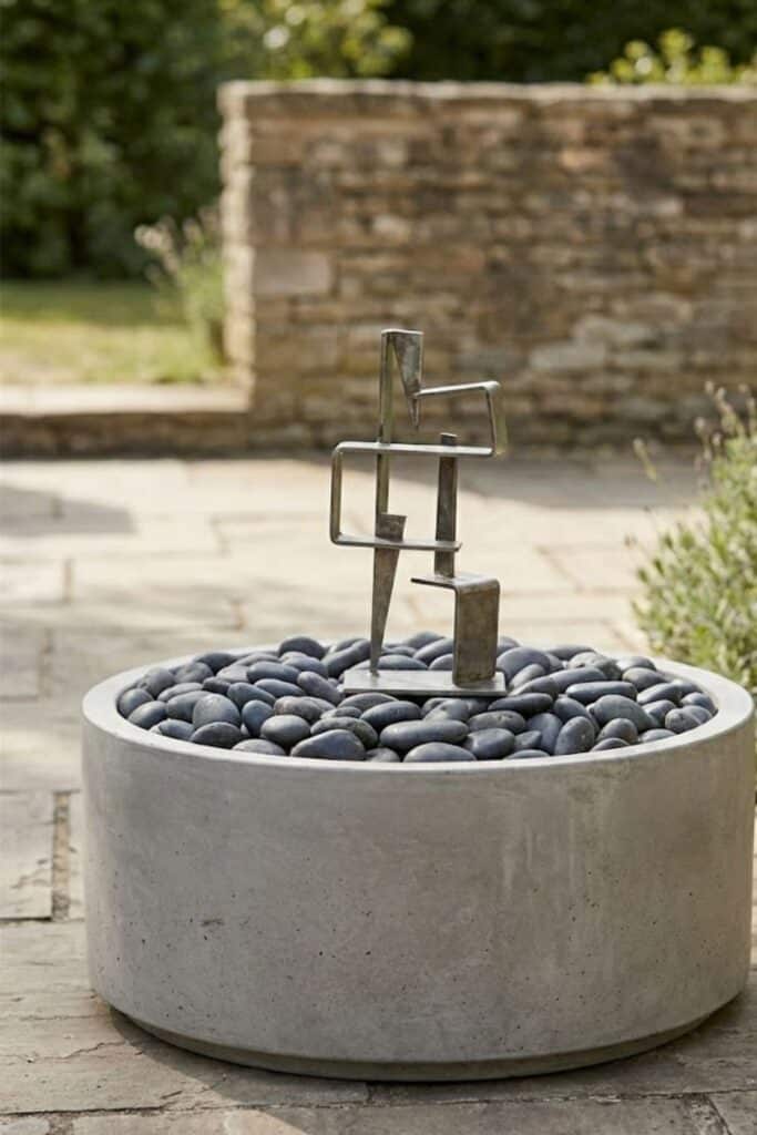 Layering stones at the base and placing a simple sculpture or object on top adds dimension. This technique prevents the planter from feeling flat or empty.