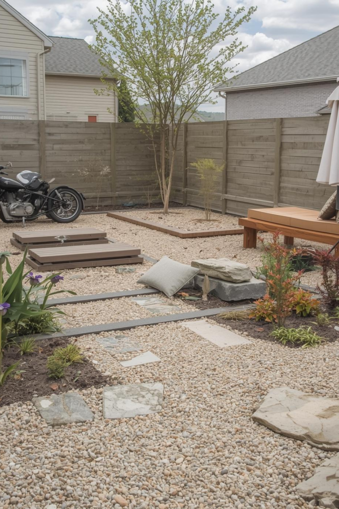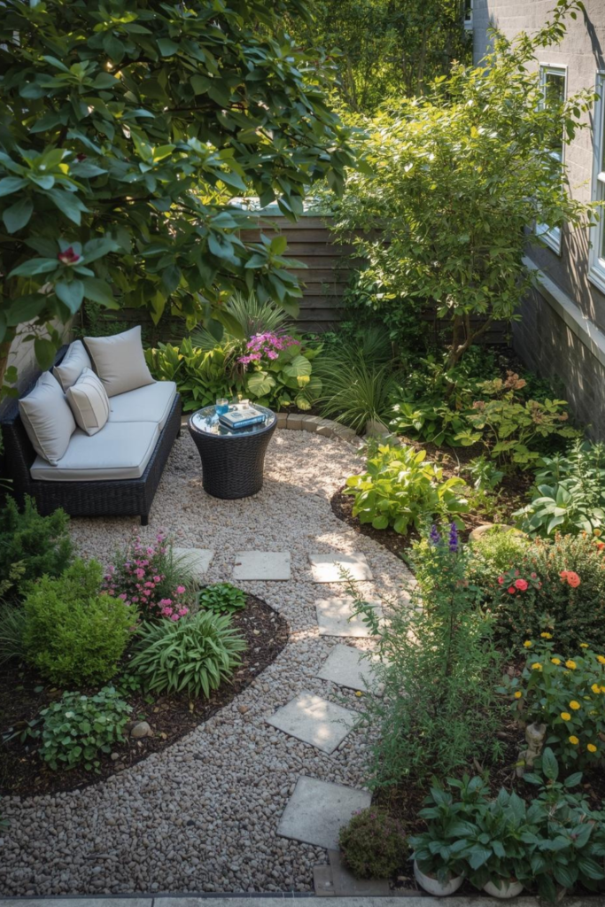 In modern small garden ideas on a budget, gravel is affordable and easy to install. It also helps define zones without adding complexity. Stone elements bring texture without constant upkeep.