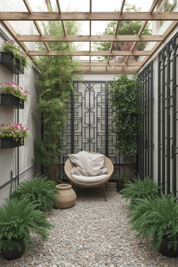 Vertical elements add depth without using floor space. Trellises, wall planters, or slim screens create visual interest while keeping the garden open. This works especially well in very small gardens or narrow terraces.